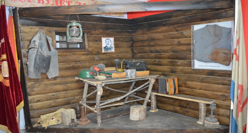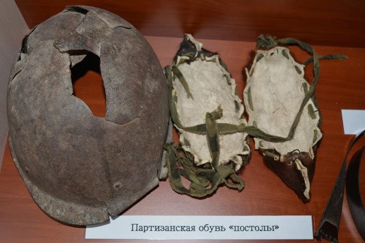 Патефон (подлинник), подаренный партизанами; затвор винтовки Мосина; каска советского и немецкого солдата; гильза орудийного снаряда; Пулеметный диск; Ручная граната времен ВОВ ММГ РГД-33; Партизанская трофейная (немецкая) фляга; Партизанская трофейная (немецкая) кружка.